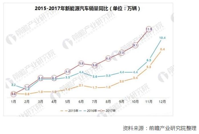 從產銷規模來看,我國新能源汽車在全球市場的比重已超過50%;據前瞻產業研究院統計數據顯示,2017年1-11月,新能源汽車產銷分別完成63.9萬輛和60.9萬輛,同比分別增長49.7%和51.4%。保守估計,今年中國新能源汽車的產銷會達到70萬輛左右,截止2017年保有量將會突破170萬輛左右。
